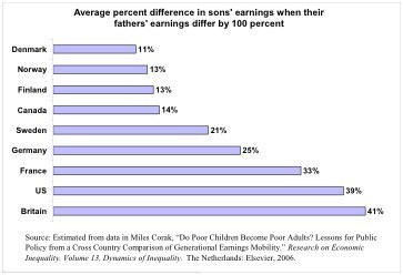 Figure 1 also tells us something about where different kinds of English-speaking adults might want to live. If they expect to be (or already are) near the top of the economic ladder and want to pass along their advantages to their children, they should live in Great Britain or the United States. If they do not expect to be near the top of the economic ladder themselves but want their children to have a fair chance of moving up, they should live in Canada. (I could not find similar data for Australia or New Zealand.) Infants cannot make such arrangements for themselves, of course, so for them being born in, say, the United States rather than Canada is just a matter of luck.
