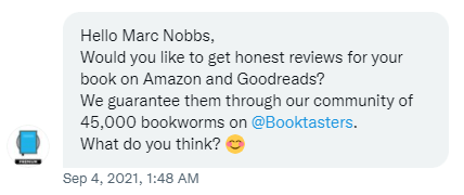 A couple of weeks ago I got followed on Twitter by a book review site. And as often happens, when I followed them back, I got an almost immediate DM from their bot.