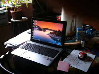 Where do you write? I'm writing this at my kitchen table. I have a small office that doubles as a guest bedroom in my house, but I tend to gravitate back to the kitchen table. I'm not sure why. I guess I like the light in here. I used to write in coffee shops, and I can still write anywhere if I need to (I have a net book with an 8-hour battery) but this is where I most often write.
