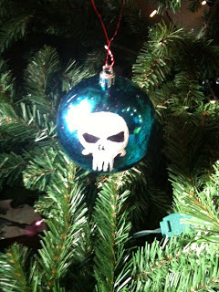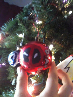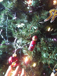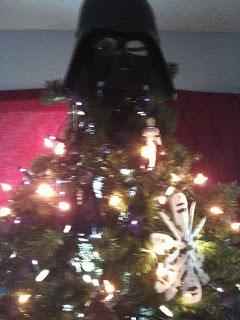 Darth Vader's head is the tree-topper on the Star Wars side. We're still looking for Batman to use on the Superhero side, but for now, Ironman is our placeholder.