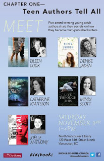 3. If you're around the Vancouver area, I'll be part of an AWESOME teen author event at the North Vancouver Public Library tomorrow, including Eileen Cook, Mindi Scott, Catherine Knutsson, and Joelle Anthony. Check out this link for more info.