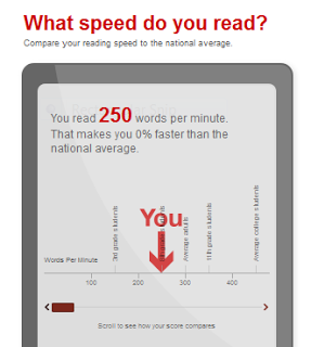 It's a tool from Staples to test how fast you read. I've known for a long time that I'm not a particularly fast reader, but I honestly thought that with all the reading I've done in the past few years, I probably had at least improved. Alas, I'm still below the national average. Here is my report: