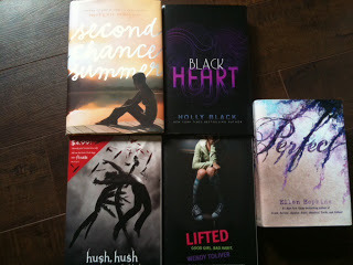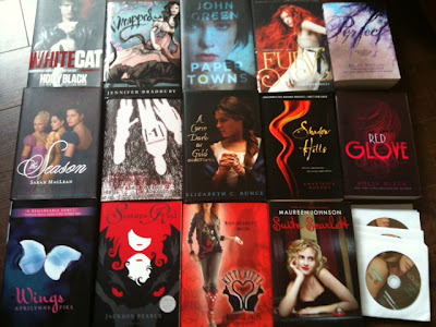 White Cat by Holly Black Wrapped by Jennifer Bradbury Paper Towns by John Green Fury by Elizabeth Miles Perfect by Ellen Hopkins The Season by Sarah MacLean The Absolute Value of -1 by Steve Brezenoff A Curse As Dark As Gold by Elizabeth C. Bunce Shadow Hills by Anastasia Hopcus Red Glove by Holly Black Wings by Aprilynne Pike Sisters Red by Jackson Pearce Kitty Kitty by Michele Jaffe Suite Scarlett by Maureen Johnson Golden (audiobook) by Jennifer Lynn Barnes The Unbecoming of Mara Dyer by Michelle Hodkin (not pictured because I was sneaking in a quick read!)