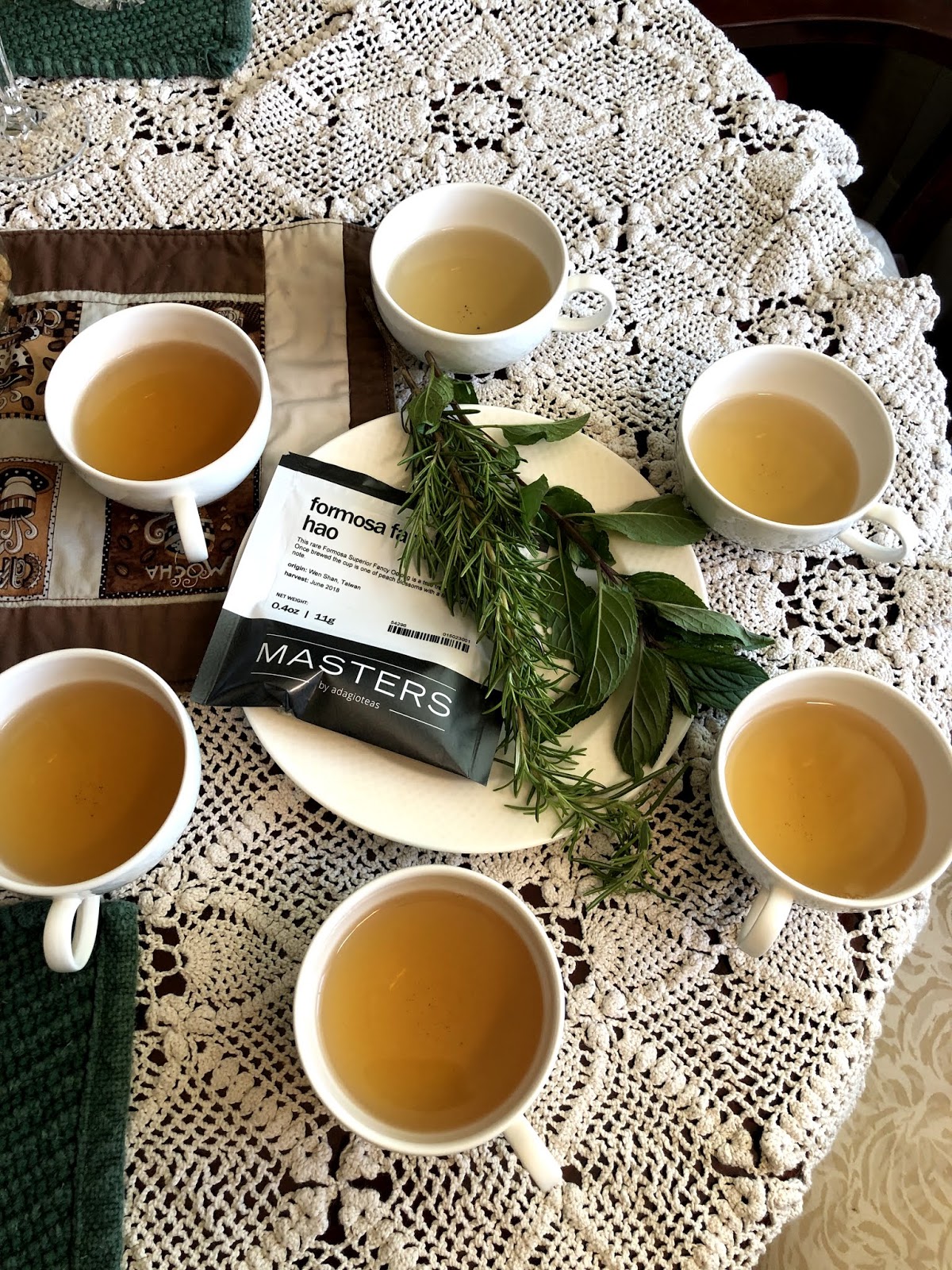 I took pictures of the tea before steeping and after steeping, but because the light is different on different days, I also included some rosemary and chocolate mint sprigs so you can compare the color of the tea.Formosa Fancy Bai Hao: