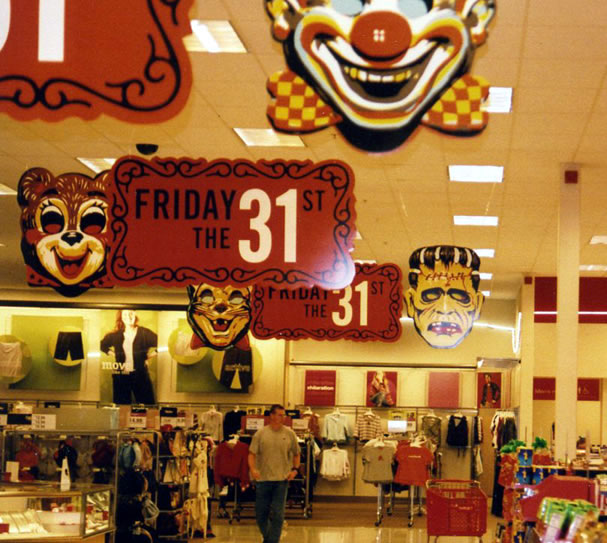 In 2003 my all-time favorite graphic design team, the Charles Spencer Anderson design co., created the phenomenal marketing materials (as well as some products) for Target's Halloween campaign. This was the crossover of the century for me— CSA versus Halloween! To make matters better, they used vintage Ben Cooper masks as source material, and enlarged them to be taller than I was as a trick or treater! In fact, I wore the identical Frankenstein mask in 1981.