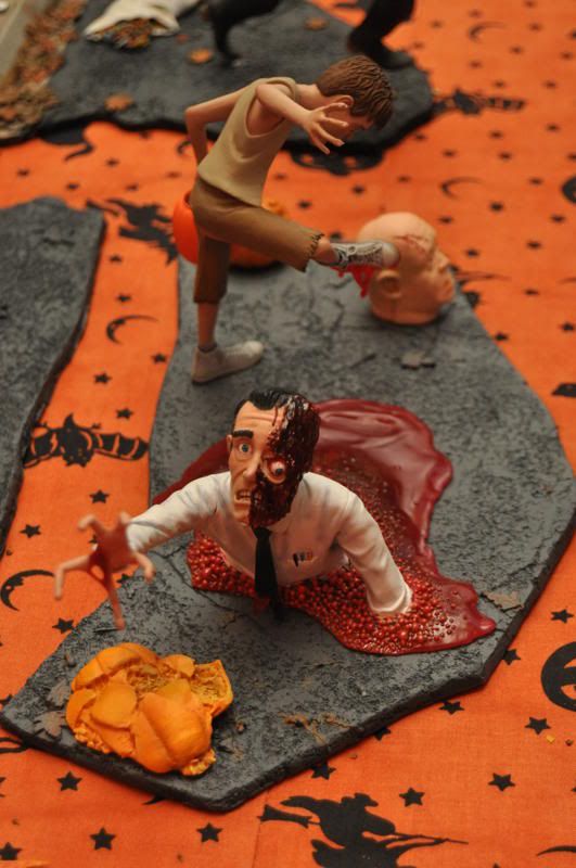 Adam Dougherty aka The KreatureKid created a set of unbelievable resin models based on the esteemed Topstone brand monster masks that were available in Famous Monsters of Filmland among other places. These have been out for over a year but they're still well worth celebrating. Dougherty not only imagined appropriate bodies to go with the familiar faces, he turned the creatures loose on Halloween night where trick or treaters must contend with them. The kids themselves are decked out in fantastic costumes from yesteryear and details such as the Hamilton's Invaders helmet, the creature costume and the trick or treat bag are spot-on recreations of the real thing. It's rare to see the essence of the holiday so perfectly captured.