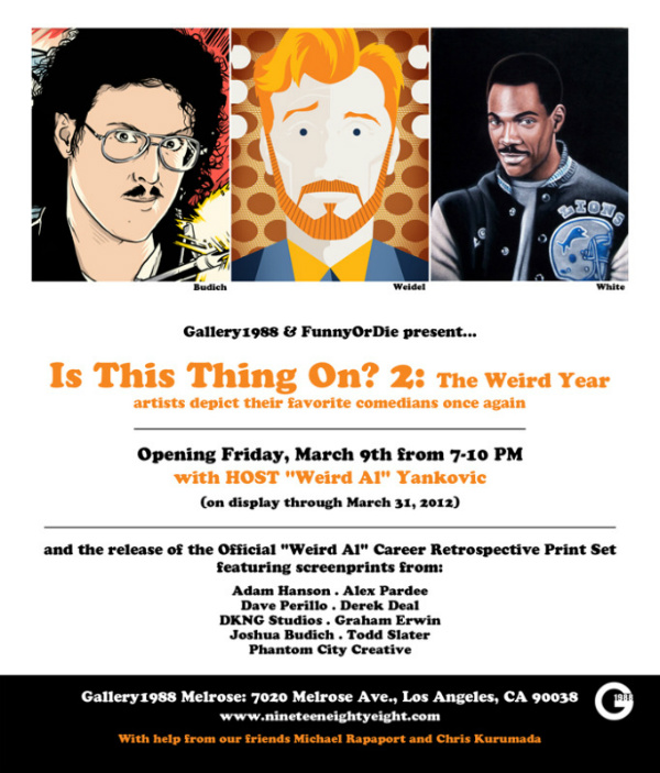 This Friday, Gallery 1988 Melrose will unveil the second installment of Is This Thing On?, an art show hosted by "Weird Al" Yankovic saluting our favorite funny people, and I'm way excited to be among the artists. My comedians of choice are Tom Scharpling and Jon Wurster of The Best Show on WFMU because about 75% of my weekly laughs come from this three-hour program. Here's my piece...