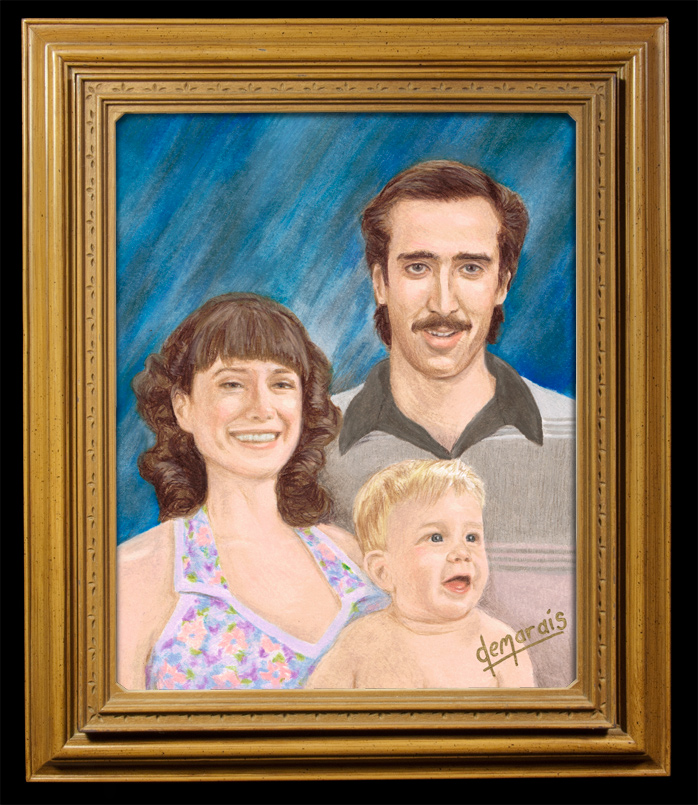 Title: The McDunnoughsDim: 8"x10"As you may recall from the film, the McDunnoughs do take a snapshot of their newfound family by way of a cheap, black & white camera on a tripod. I started to simply reproduce that, but in the middle of the process I scrapped the idea because it was a bit too spot on. Being a huge geek, I like the portraits to gel with the timeline of the film (or series), and I even try to pinpoint when it would have been taken, be it before, during or after the story takes place. However, in this case I made an exception, this is the way they wished things would have turned out.