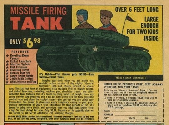 There is a subcategory of comic book mail-aways that could be labeled "Cardboard Vehicles" no that's too boring, how about "Corrugated Fiberboard Dream Machines." Actually I'll stick with the first one. The most often advertised Cardboard Vehicles include the Polaris Submarine, the Jet Rocket Space Ship, and the Missile Firing Tank (a Space Shuttle emerged later on.) Prior to this day, I, nor the internet at large has yet to witness any photographic evidence of the tank, and I think you sense what's about to happen. Yes, thanks to the unbelievable archives of Dan Goodsell of Tic Toc Toys and creator of Mister Toast you are about to witness THE MISSILE FIRING TANK!!...