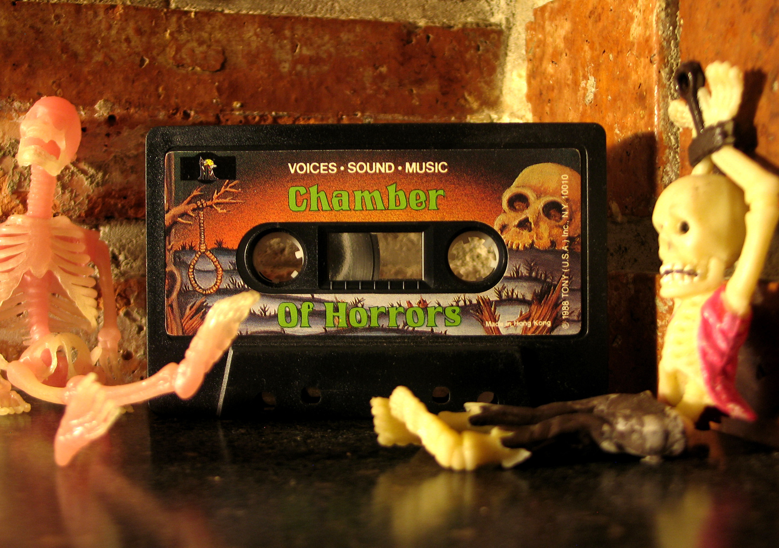 Title: Chamber of HorrorsManufacturer: Tony (U.S.A.) Inc.Year: 1988 Total Runtime: 45 Min Repeats on both sides: Yes (but not on the earliest version) Stories: No Music: It kicks off with a familiar pop song. Then the jazz fusion takes over. Narration: No (but there is on the earliest version) Distinct Audio: A man who sounds like he lacks personal boundaries yells “Happy Halloween!” many times.