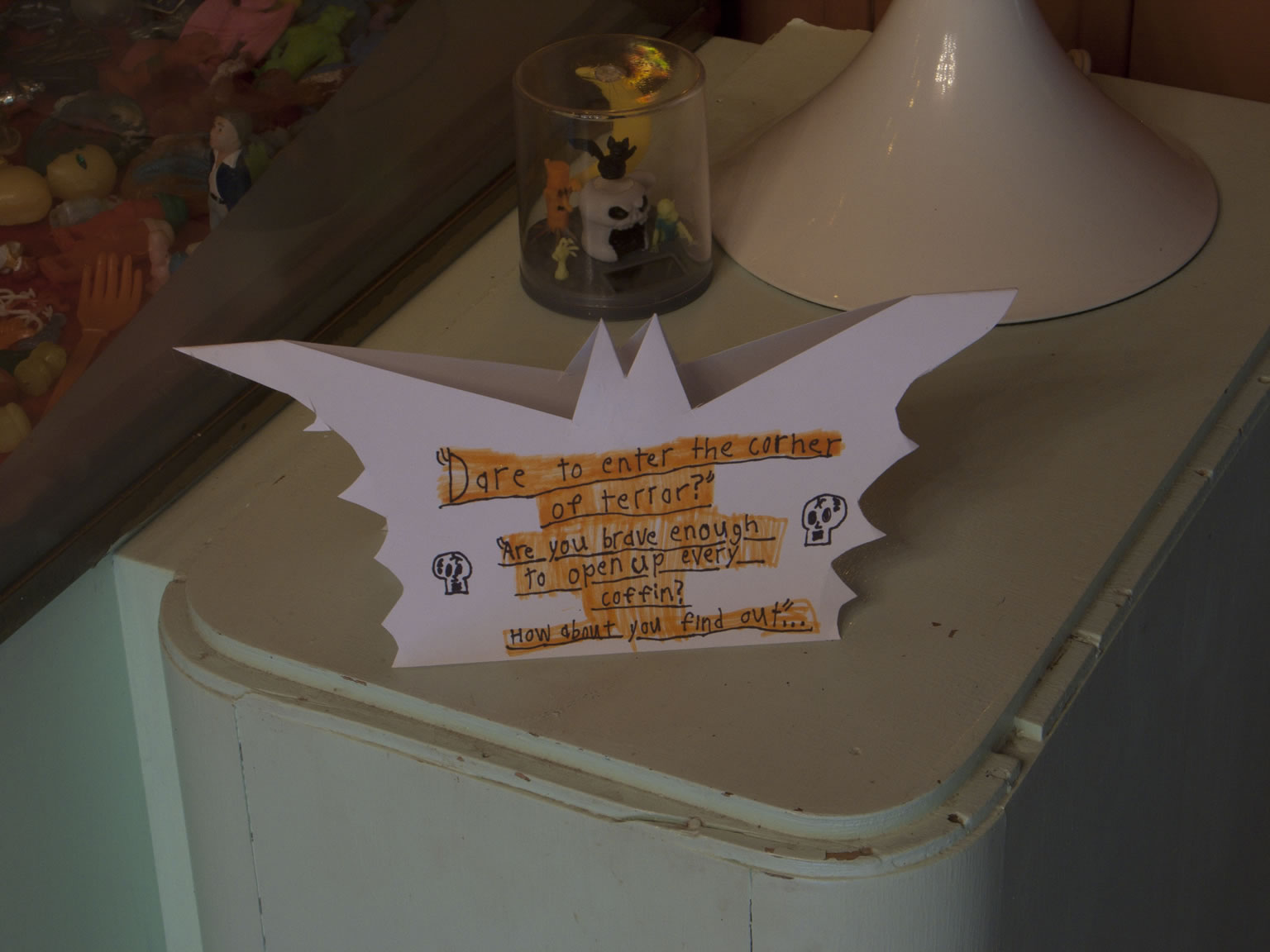The best thing about my mood table is that it inspired my son to make one of his own, which he calls the Corner of Terror. Not only did he put together a bunch of stray monsters, he set up a series of poetic instructions that ultimately lead the victim to open a coffin filled with spring-loaded snakes.