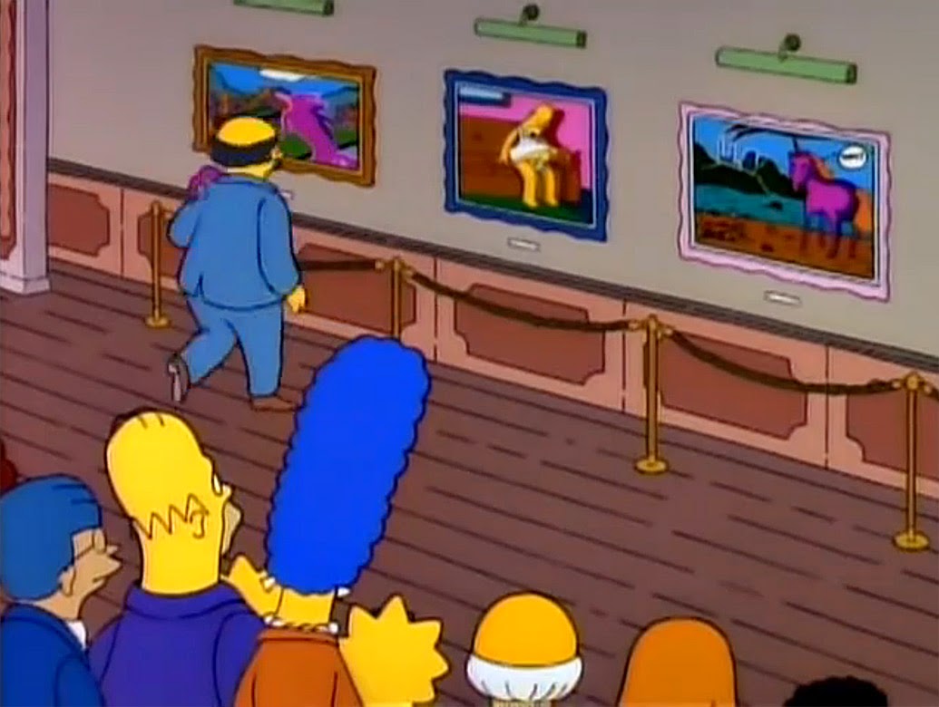 Though it only appears onscreen for a split second I've always considered it one of the highlights of the episode. It perfectly satirizes what happens when an artist has a message, but no sense of subtlety. I was tired of pausing my VCR to get a laugh at it, so I decided to paint it. It was like bringing a Simpsons prop into the real world and hanging it on my wall.