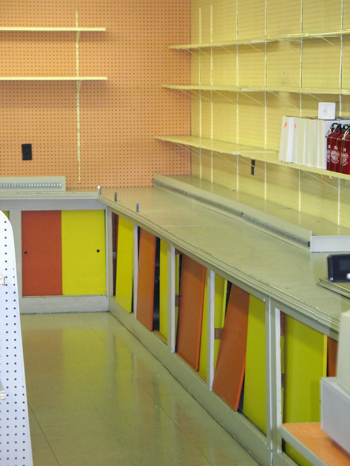 Should you find yourself in a souvenir shop with a basement level, ALWAYS get yourself down there. It's often the greatest hodgepodge of older stock. In this case they were remodeling, but even then the two-toned pegboard and colorful cabinets were well worth a trip downstairs and a photo...
