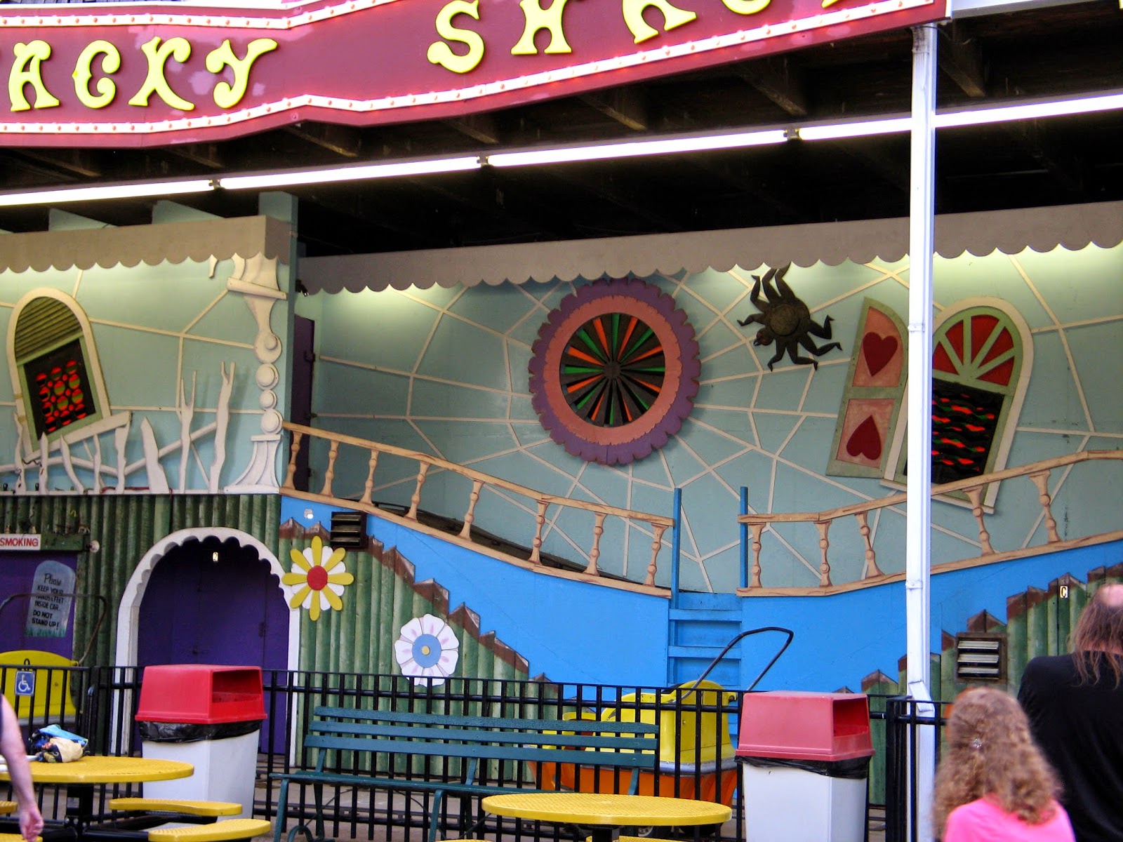 While the name seems like a shameless rip-off I must give props 'n kudos to Ghost Blasters. It's the most populated of them all, since it's a ride-n-shoot type of thing. Also, for making the letter "O" into the ghost's mouth. Most importantly, I salute them for maintaining traditional spook house imagery with a blacklight presentation. When you count your blessings, make sure one of them is the fact that sheet-ghosts and skeletons are part of the public domain.