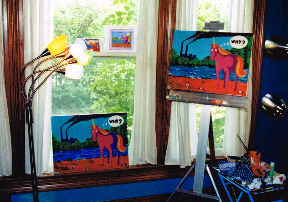 Description: An oil painting of a unicorn standing in the foreground with a thought bubble asking, "Why?" There's a nuclear power plant in the distance.