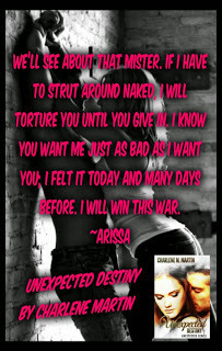 Arissa experiences some life altering events that change her perspective on life, she also finds out that the man she has been dreaming of is actually a real person, not only that he is the guy that came to her when she needed him most. Shortly after that their love story begins. Arissa and Christian have a passion-filled romance, but the problem being Christian refuses to sleep with Arissa and she is very persistent in her attempts. Find out more in Unexpected Destiny now released! You can purchase both books at barns &noble and amazon links are below. Amazon.http://www.amazon.com/Unexpected-Destiny-Series-Charlene-Martin-ebook/dp/B00HL2MEXG/ref=sr_1_2?ie=UTF8&qid=1388595312&sr=8-2&keywords=Unexpected+destinyBarns&Nobel http://www.barnesandnoble.com/w/unexpected-destiny-charlene-martin/1117902276?ean=2940148977551 Thanks for your support and please leave a review where you purchase your books. They are the best way to thank an Indie Author.Author Charlene Martin