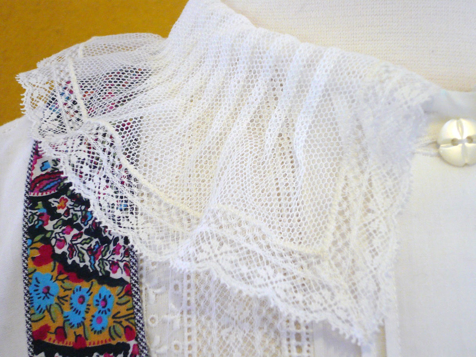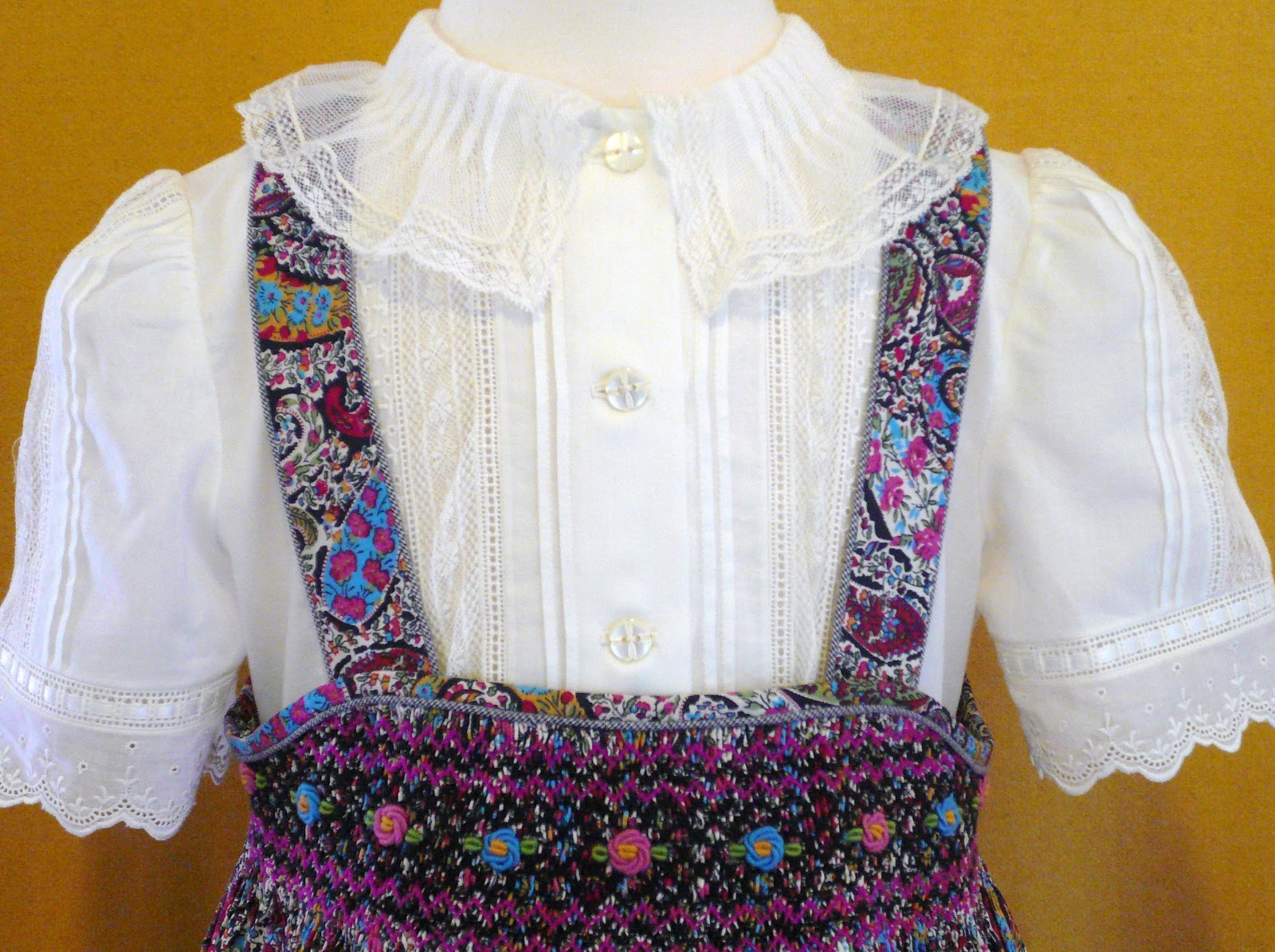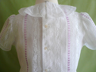 The edges of the pocket flaps, mock front yoke, and ruffle sleeves are finished with entredeux which has been trimmed and embellished with a cross stitch and running stitch in two contrasting colors.