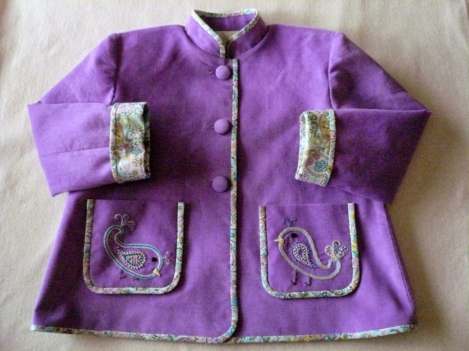The jacket is completely interlined with 'baby' interfacing for better weight and wrinkle resistance to the feather weight corduroy. It is fully lined with lime 1/32" micro check and has an adjustable fold up sleeve length. The embroidery on the pockets are simple beginner hand stitches - chain, French knot, and backstitch. The little bird is just one of the paisley shapes from the print inverted and embellished.