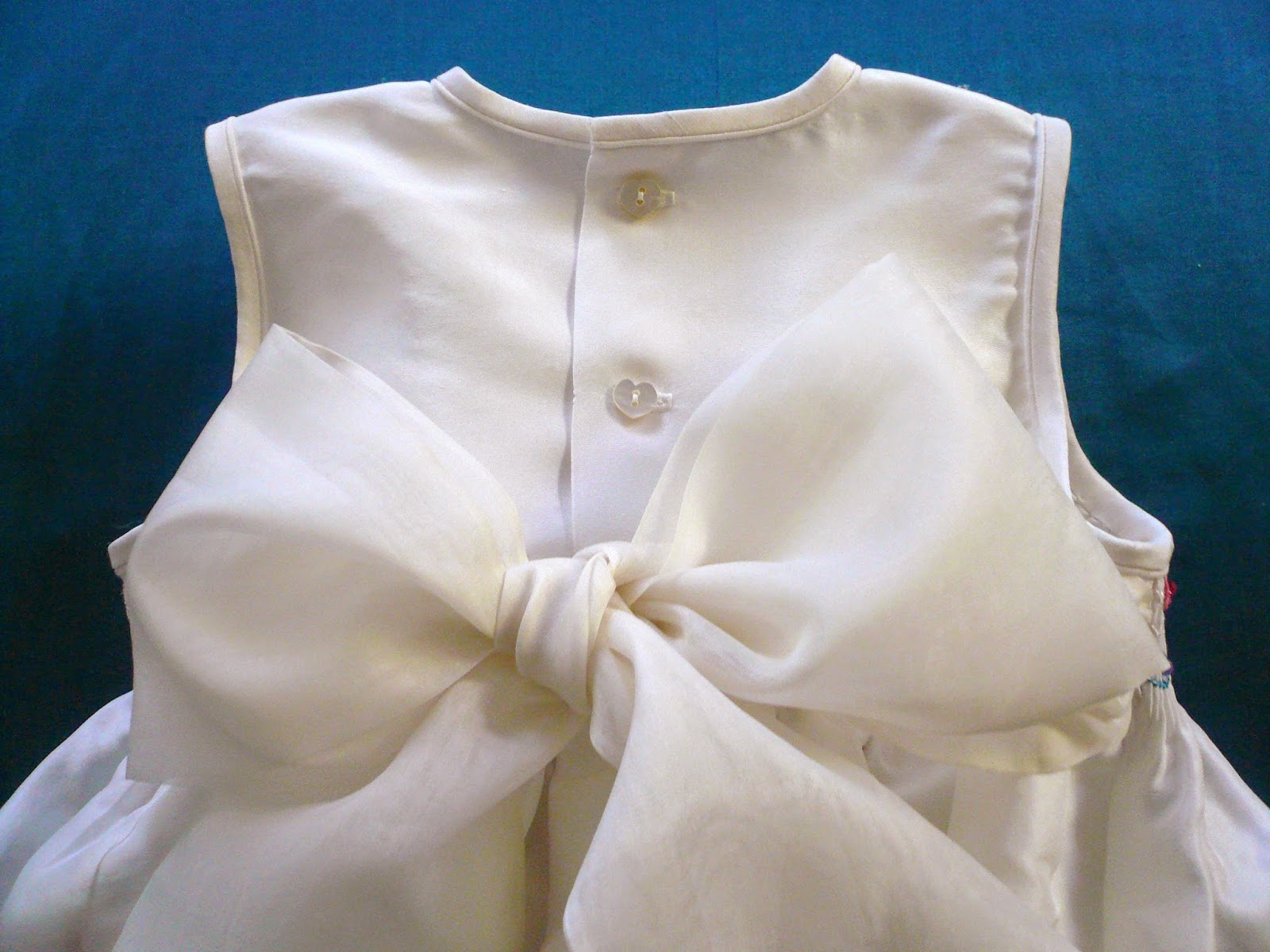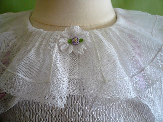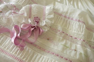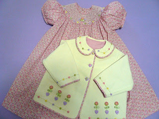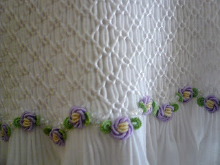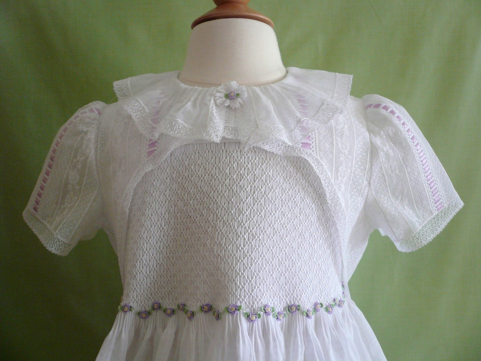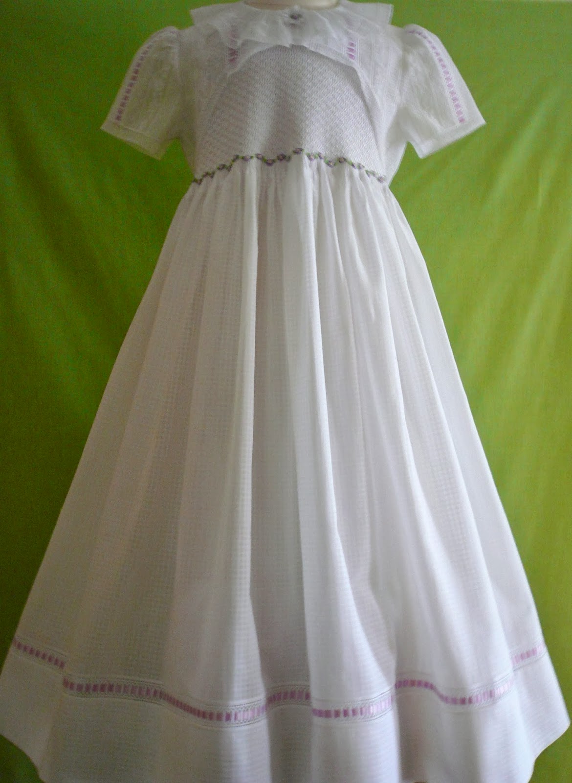 The cut away over jacket is all white Swiss and French laces worked over a layer of white silk organza. The sleeveless smocked dress stands quite well on it's own and dresses up very well with the added lace jacket. The smocking and embroidery is all worked with rayon thread which I have to admit made me a bit crazy. Love the finished result but don't love the process of working with the rayon threads