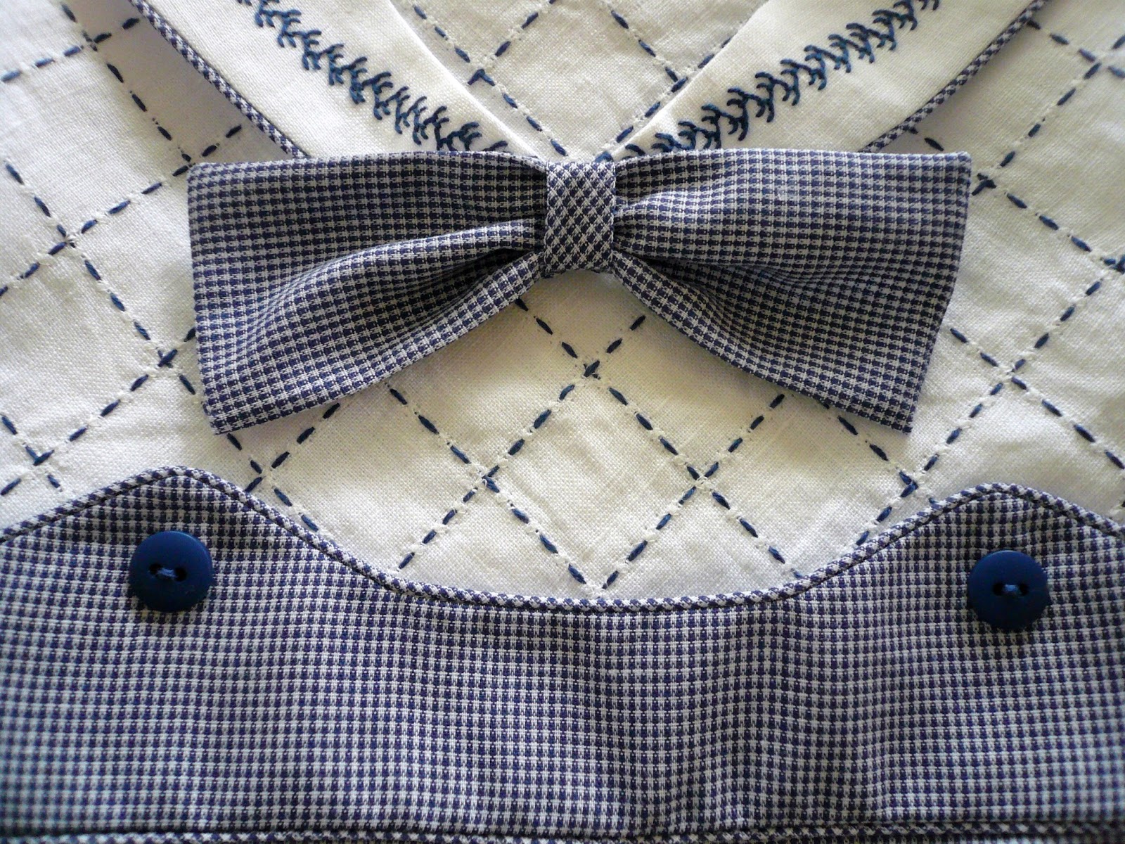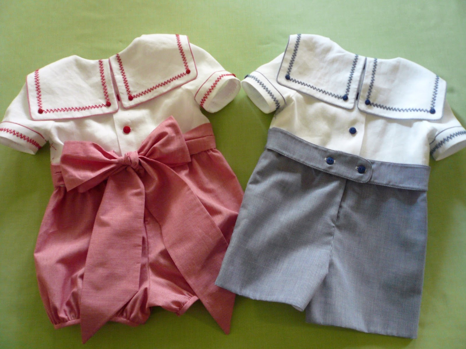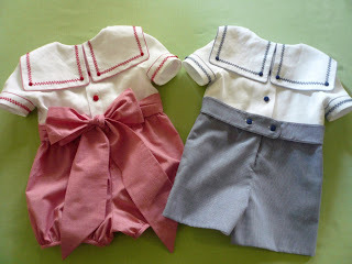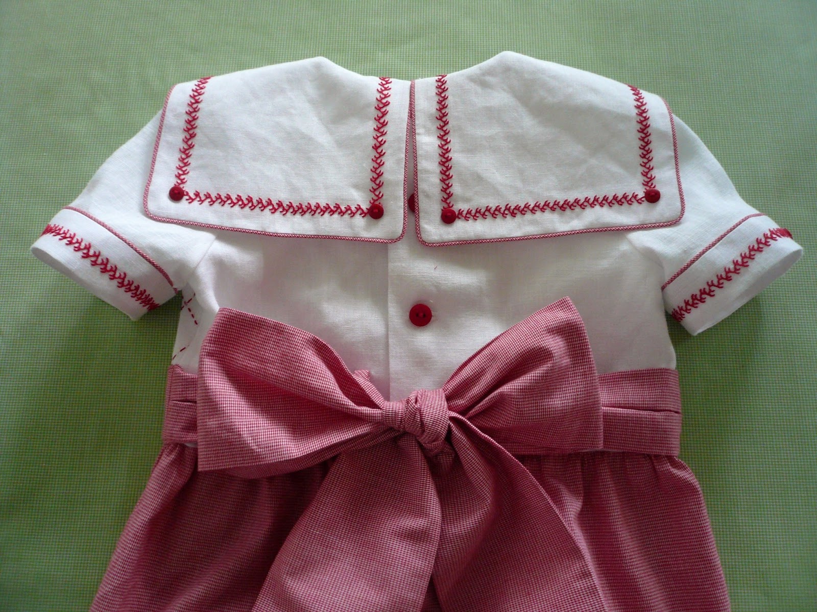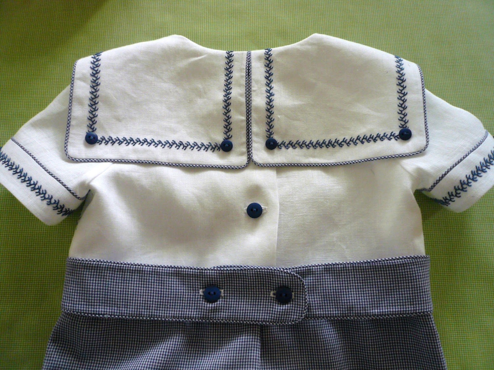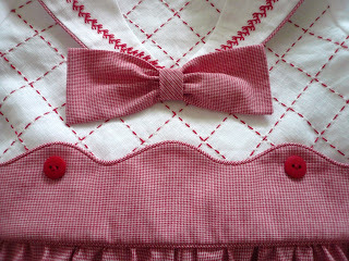 The girl and boy versions have a white linen top and a 1/32" cotton micro check bottom. The bodice front has a pulled thread grid which was machine stitched with an entredeux stitch and then the red or blue floss was woven through the holes created by the machine. The sailor collar and sleeve cuff feature a line of hand stitched double feather stitch. The girl sleeve has some 'puff' at the cap in contrast to the fitted sleeve on the little boy romper.