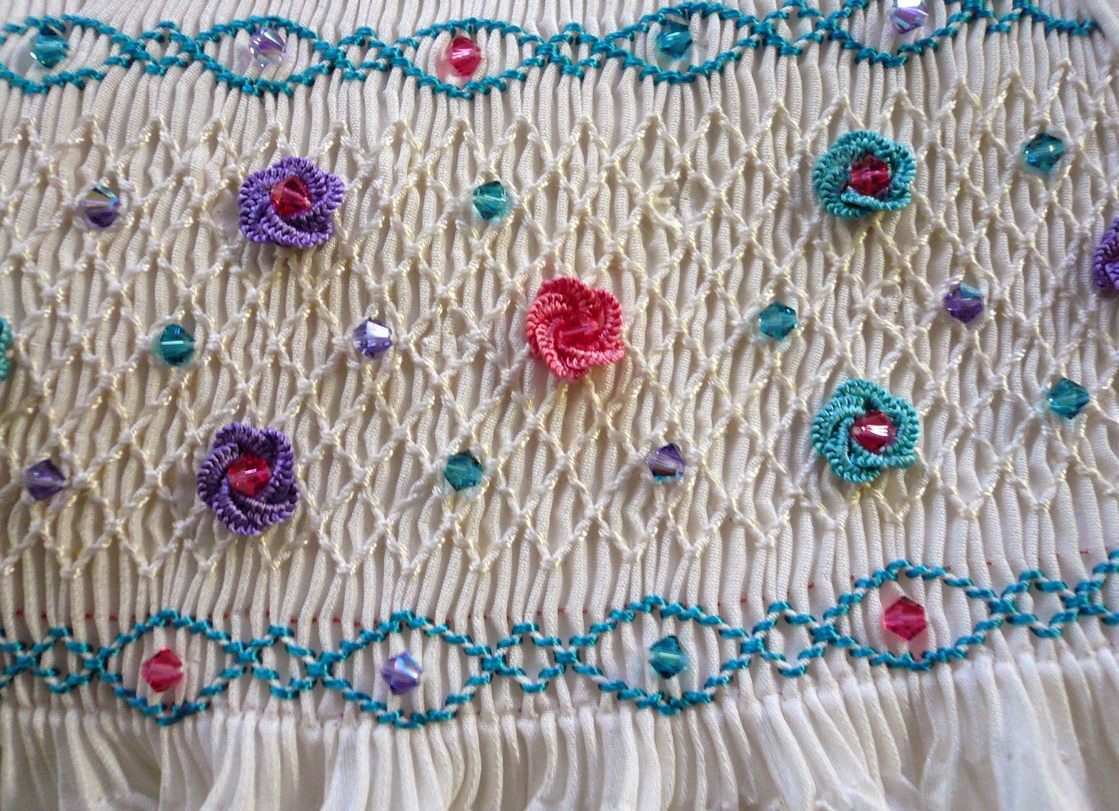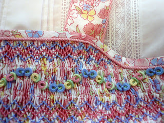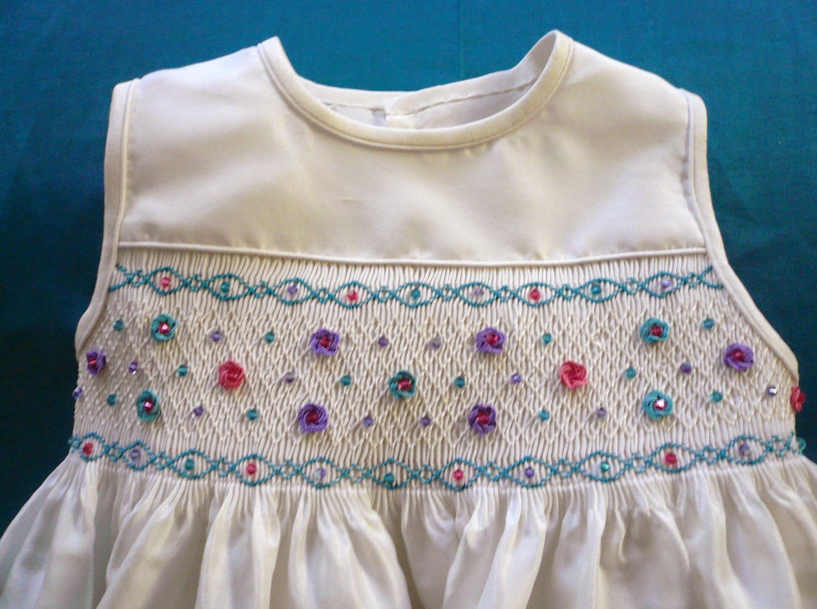 I chose Marlitt (rayon) floss to do all the smocking and embroidery because of it's beautiful sheen. It's a bit of a nightmare to work with but I love the end result. I was lucky to find Swarovski crystal beads in just the right colors to complement the smocking. In the daylight the front of the dress really sparkles.
