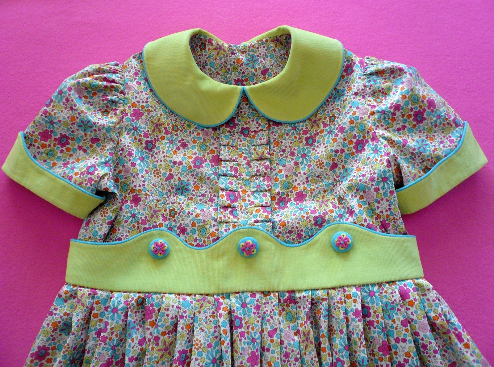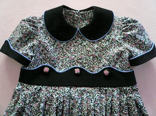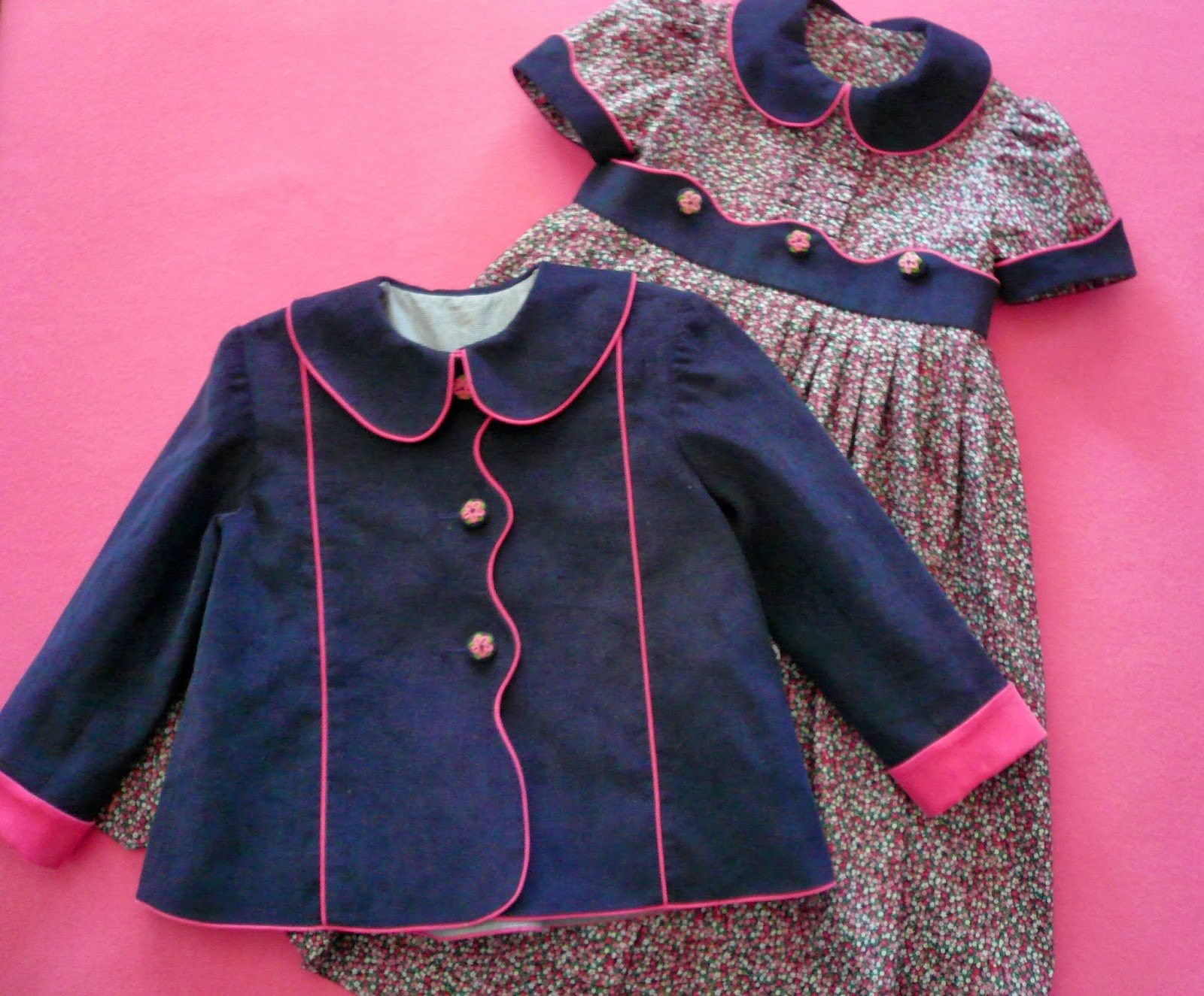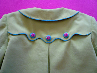 The coordinating under dress has a sewn in piped corduroy belt and shaped corduroy cuff on the sleeve to tie in with the scalloped and piped edges on the jacket. The button down the back skirt of the dress is pleated rather than gathered onto the bodice. It gives a nice tailored look while still keeping the 'twirl' factor in the fullness of the skirt.