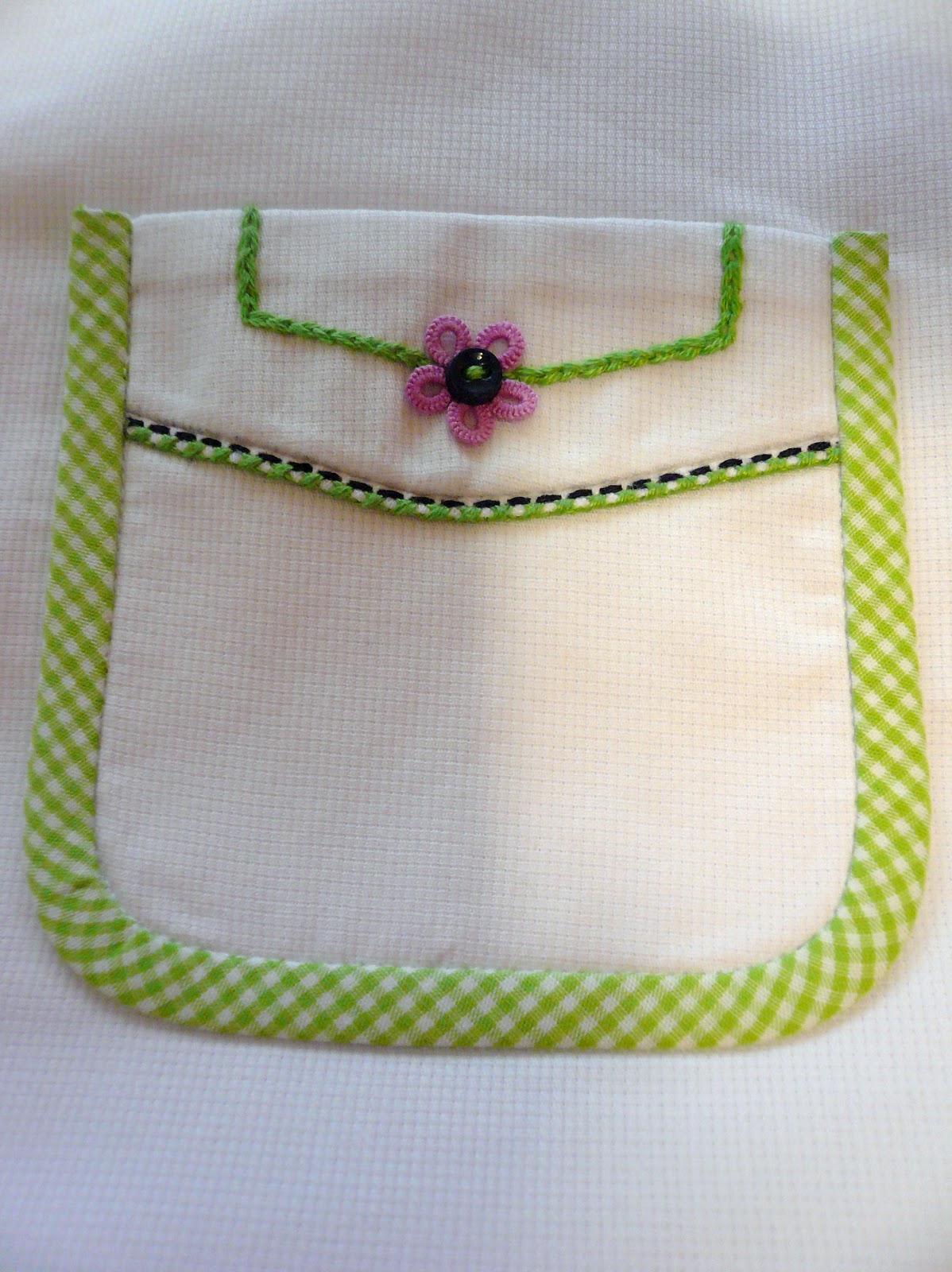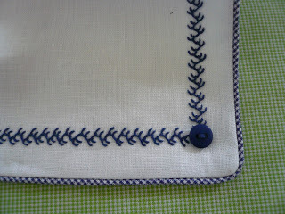 The interfaced pockets have an embroidered, entredeux trimmed flap and are bound with 1/16" lime microcheck. I like to prefinish my bindings to the exact length needed, using a technique that angles the ending seam allowance away from the final finished edge. It gives a much cleaner, less bulky finish than trying to tuck the binding end seam allowances in at the finished edges. I prefinished the length of the bias bindings on the neckline, pockets, and lower edge of the swing top.