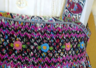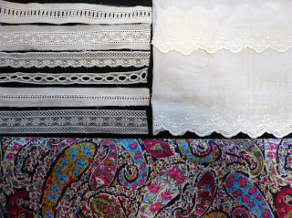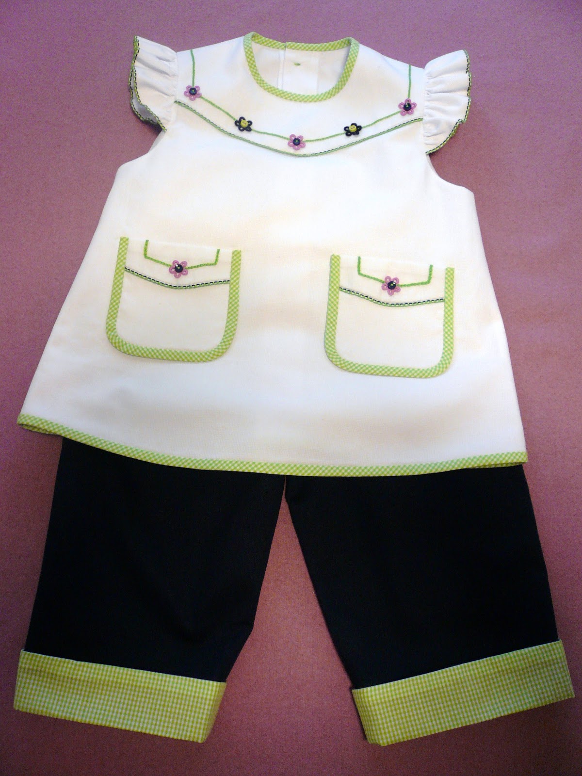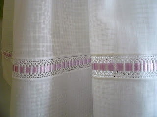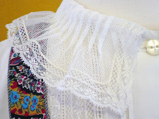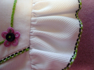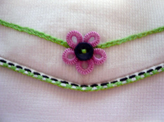 I'm been having a bit of fun making capri sets that incorporate heirloom techniques in the small size manageable format of a swing top and pants - not yards and yards of full skirts and ruffles. This one has a bit of hand embroidery, button centered cast-on flowers connected with a chain stitch, an interesting two color entredeux edge trim, and lots of French bias bound edges.