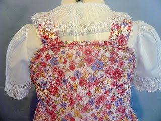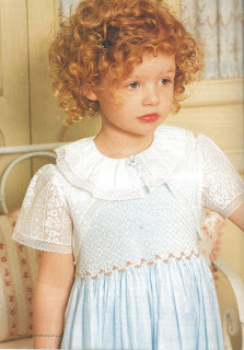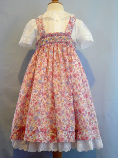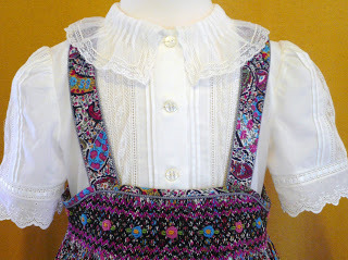 The smocked jumper slips on over the head but has plenty of tricky construction points with all the piped, curved, French bias bound edges. The underdress/slip, as mentioned in my earlier post, includes lots of 1/8" tucks, Swiss and French laces, and a cotton netting collar.