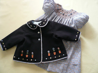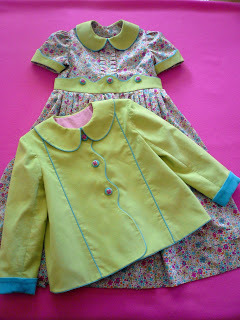 I have had lots of requests to expand the size range of the swing style jacket that was published in my Sew Cute Couture book (Cute As A Button if you have the Australian publication - the content of both books is exactly the same) The original jacket was sized 6 months through 3 years and was styled with a full cut sleeve and a back yoke with a 2" center back pleat for width to accommodate the fullness of the matching bishop dress. Here's a couple of different fabric variations made up from the pattern in the book.