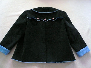 The jacket has a more tailored two piece sleeve and allows for a turn back cuff in the contrast fabric. This turn back sleeve also buys adjustment and growth room. The back of the jacket has lots of visual interest with a scalloped, piped yoke overlay and a 3" box pleat down the center back.