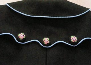 I had enough of the coordinating dress fabric left over so I chose it as a lining for the jacket. This jacket goes together completely on the machine with the exception of the little bit of hand work involved making the cast-on stitch flowers on the self fabric covered buttons.
