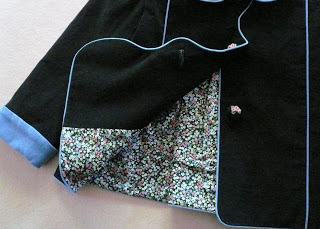 My new project is made up in black feather wale corduroy with lots (lots!) of periwinkle blue corduroy piping. Because the feather wale corduroy is not really heavy enough to be jacket weight I fused light weight interfacing to the back of the uncut yardage prior to cutting out the pattern pieces. It gave the corduroy a beautiful 'hand' and great stability which I think saved me when trying to pipe around all the scalloped edges.