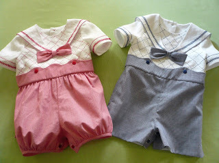 The sewn in shaped belts are piped at top and bottom. The girl romper has a tie sash in the back and the boy version is more tailored with a lapped button back belt. These rompers are a bit more complicated to put together than they might appear. I like everything to line up at the center back and this project presented a few challenges in that department.