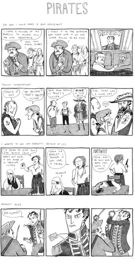 I've been drawing pirates. It seemed natural to make comics out of them! Maybe someday I will get to some sweet real pirates, like Jean Lafitte or Anne Bonny or etc etc.