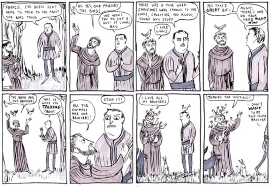 A long time ago I made a comic with St Francis of Assisi in it, but I was reading about him again recently so here he is, again. Being raised under my mother's dutiful Catholic watch, I had several childrens' books of All Star Saints and had a list of faves, in which Francis always figured because he was usually depicted with a load of animals. Especially birds. Birds, Birds, Birds. And sometimes some other...
