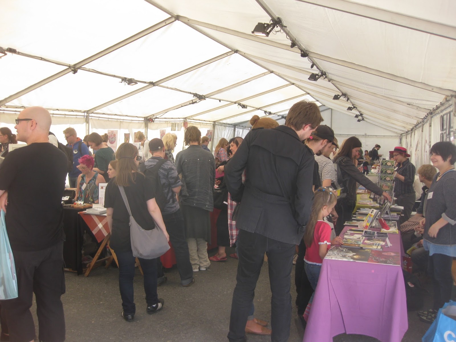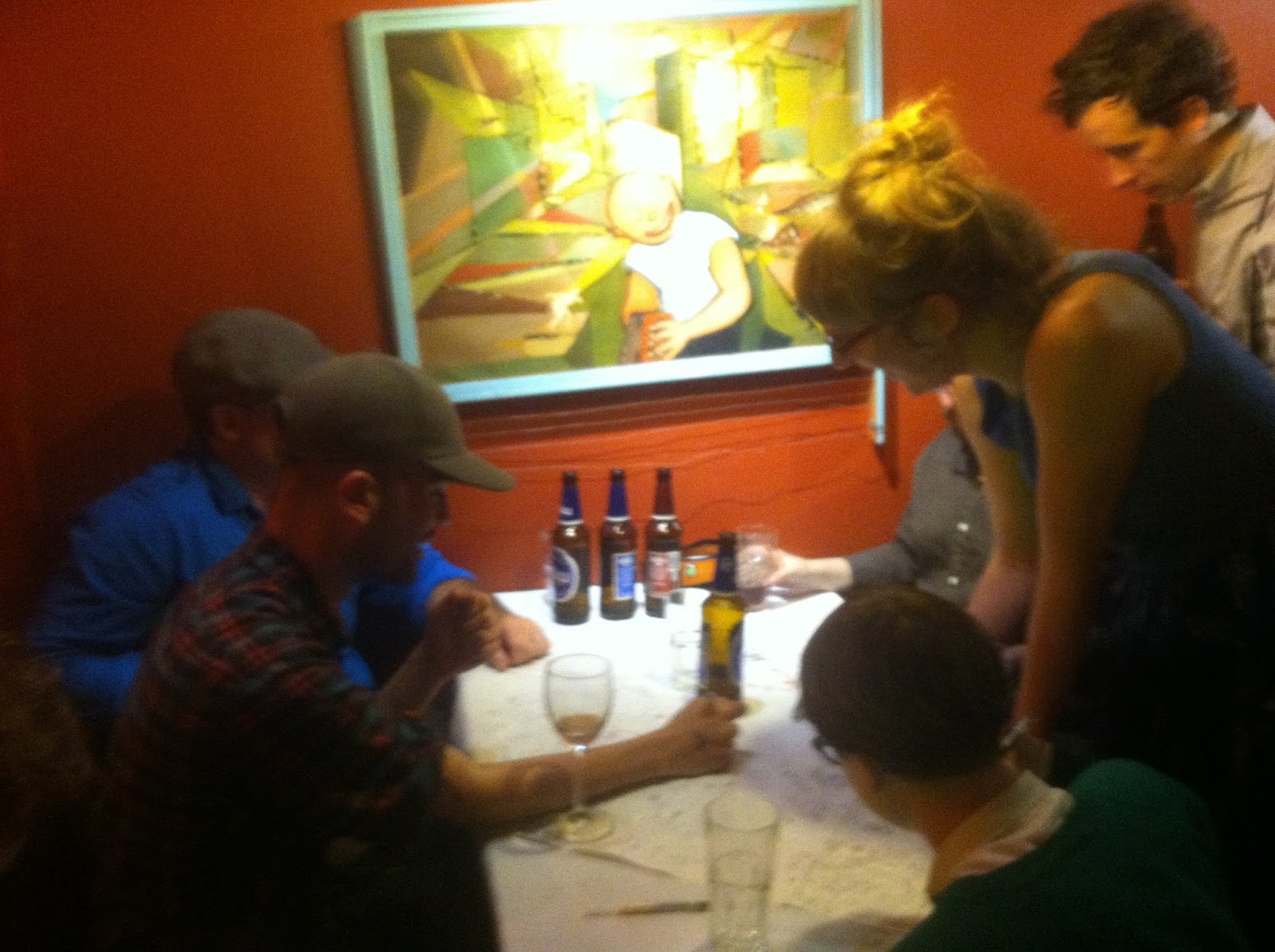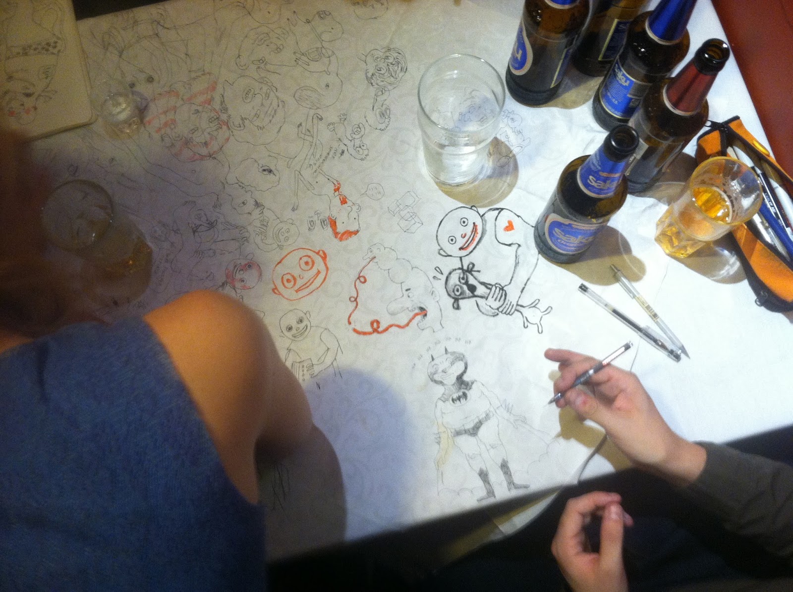 There were multiple festival events planned for every evening of the festival weekend, all fun and well-organized. We hung out quite a bit throughout the weekend with the extremely talented batch of Canadian cartoonists Julie Delporte, Joe Ollmann, Philippe Girard, Michael DeForge, Howard Chackowicz, John Martz, and Conundrum Press publisher Andy Brown. What a wonderful group of people! Here everyone is drawing wildly on a table cloth at the Kafe Moskova bar.