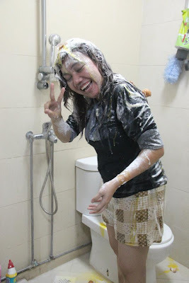 Yangterjadi berikutnya adalah, saya diseret ke kamar mandi, diguyur air, tepung,banana milk, telur, dan entah apa lagi. Nggak tanggung-tanggung, yang ngeguyurdelapan orang! Felix, Andrew, Didi, Melvin, Cindy, Yovani, Nadia, and Bella.GILEW! Ternyata habis dari Orchard mereka nggak pulang, tapi "belanjabahan-bahan" terus ke rumah, dan Jovi udah bukain pintu untuk mereka sebelumdia tidur, makanya mereka bisa masuk, dan ngetok pintu kamar. Cerdas sekali -_-