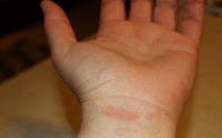 Here's the thing, I was innocently preparing pasta for supper last night when suddenly and with provocation a noodle leaped from the boiling water and slapped me on the wrist and burned me. (As you can clearly see in exhibit A.) I stood there, stunned for a second or two. Pain seared my arm as my alleged noodle assailant clung to my wrist, burning the skin and quite possibly attempting to inflict disfiguring third degree noodle burns. Fortunately, I had the presence of mind to dash to the kitchen sink, run the cold water and cool my wrist. Now this may not seem like such a big deal but this morning I discovered a secondary problem with this burn on the wrist. It is in exactly the place I rest my arm on my laptop as I type, directly on the edge of my Mac. What are the odds? I mean really, who get's noodle burns? Criminy!