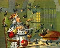 Here's the thing. You rally can bake live birds into pies. What a hoot. So-called animated pies or pyes were the most popular banquet entertainment back in the 13th and 14th century. The nursery rhyme "Sing a Song of Sixpence . . . four and twenty blackbirds baked in a pie," refers to such a pie. According to the rhyme, "When the pie was opened, the birds began to sing. Wasn't that a dainty dish to set before the King." True story. Not only did the birds sing but they probably flew happily and with a beak of relief, out into the banquet hall. But that's not all, my pretties, rabbits, frogs, turtles, other small animals, and even small people (dwarfs) as we learned yesterday were also placed into pies. Sometimes pies had birds and a dwarf to be released when the crust was cut. The dwarf would emerge and walk down the length of the table, reciting poetry, sketching the guests, or doing tricks. Now how politically correct is that? Yikes. Anyhoo, just in case you want to bake a pye with blackbirds, here's the recipe.