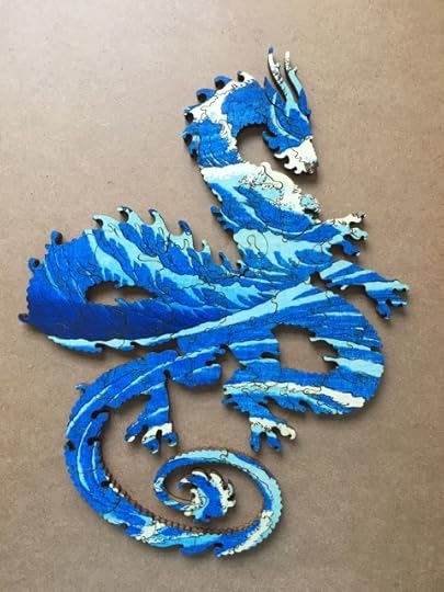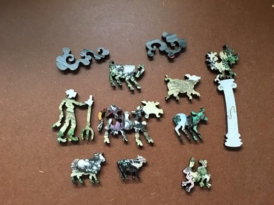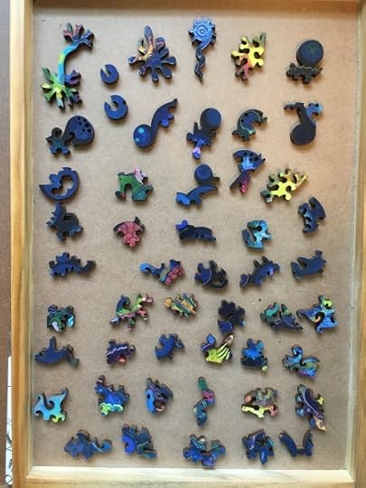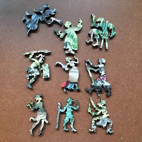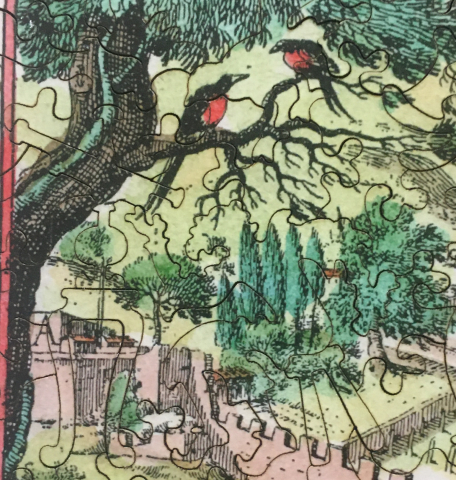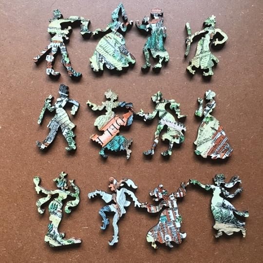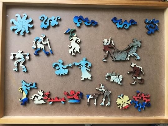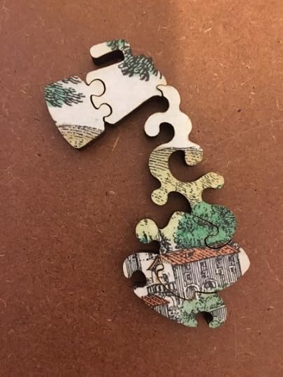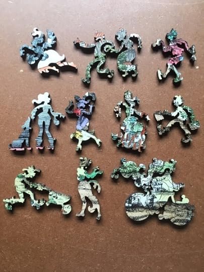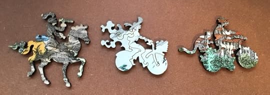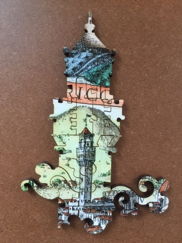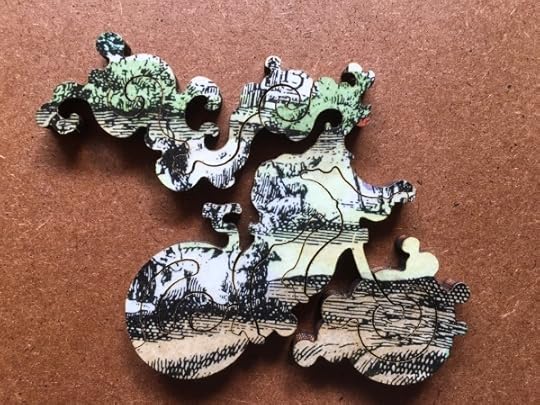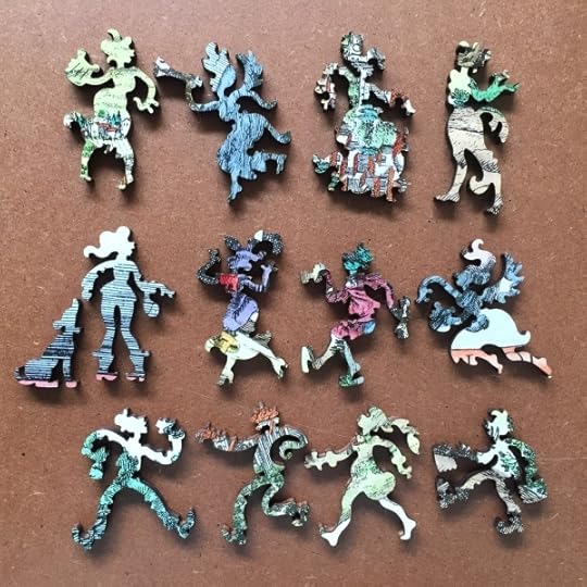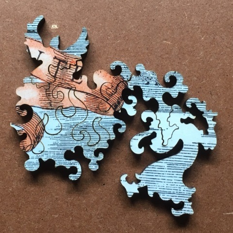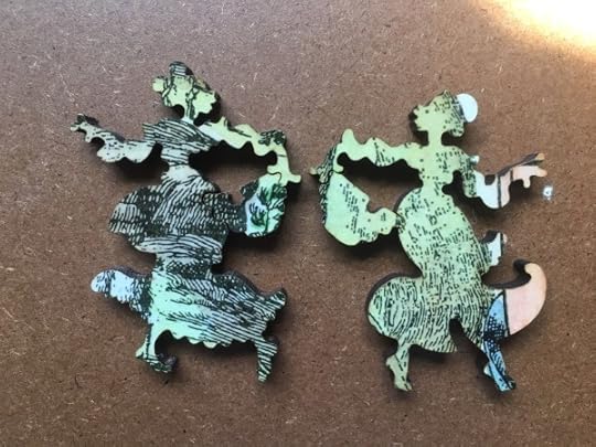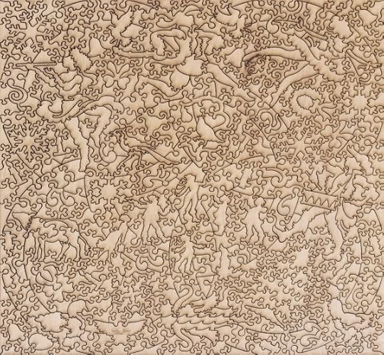 More Internet research disclosed another maker of artisanal wooden jigsaw puzzles with devoted fans. Artifact seems edgier than Liberty—more Wes Anderson, less Merchant Ivory? Their whimsies look blockier and less fantastical; but their pieces are nice and chunky, and their cuts look deliciously devilish. I really love some of their images: they do a nice range of early stuff (Bruegel and Bosch and Archimboldo) and they have a taste for the SFnal-fantastical.