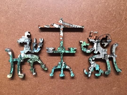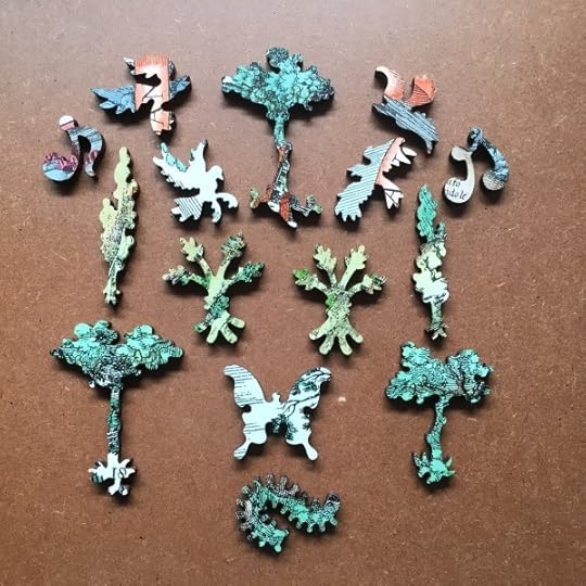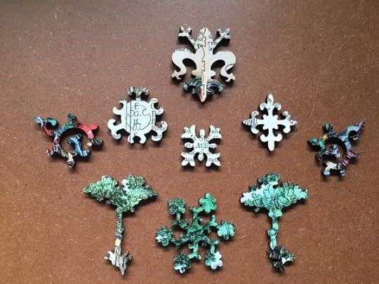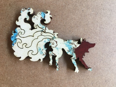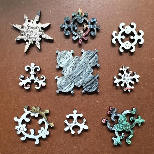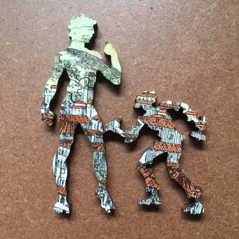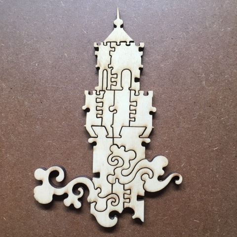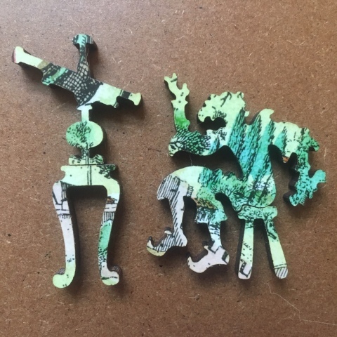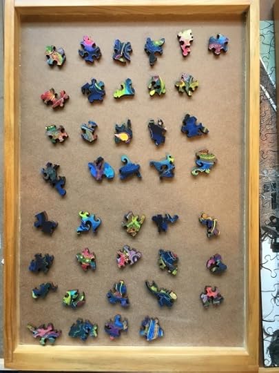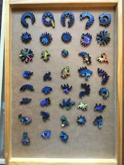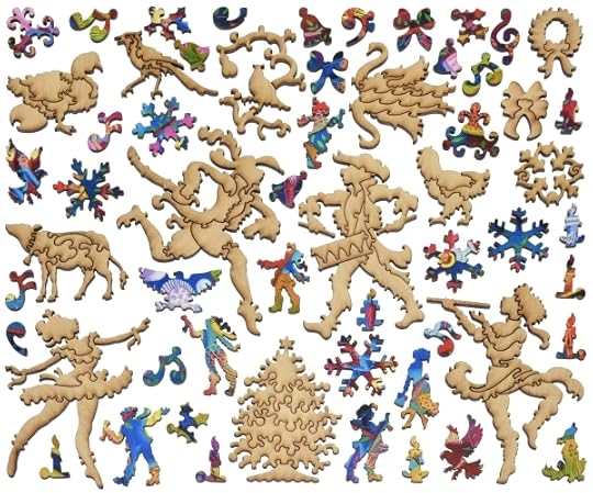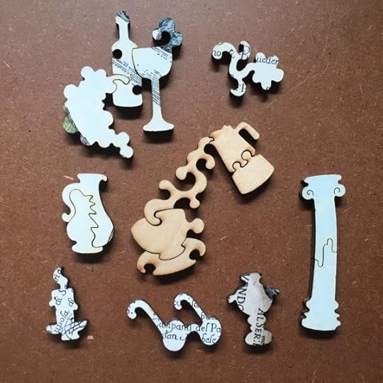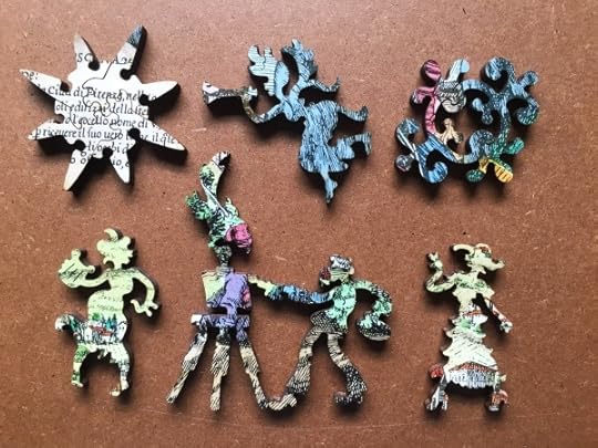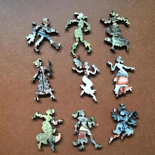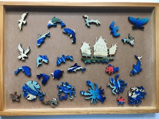 More Internet research disclosed another maker of artisanal wooden jigsaw puzzles with devoted fans. Artifact seems edgier than Liberty—more Wes Anderson, less Merchant Ivory? Their whimsies look blockier and less fantastical; but their pieces are nice and chunky, and their cuts look deliciously devilish. I really love some of their images: they do a nice range of early stuff (Bruegel and Bosch and Archimboldo) and they have a taste for the SFnal-fantastical.