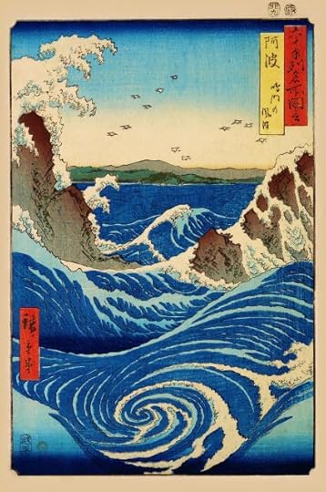 There are, of course, all sorts of people going on about their lives. I especially love the samurai cut from pure sky, with a white gull at his hilt. But the workers (dyers?) stirring up a tub are excellent. Look at the one poised with a wave's withdrawing strength and legs of seafoam. And the little scene with diners at a table, a sushi chef, and a server slopping the sake is diverting.