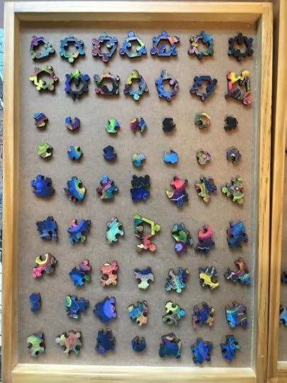 The puzzle falls into four panels, neatly buttoned together. It comes in two boxes, lined with purple-and-violet or violet-and-purple tissue paper, each (as I discovered) corresponding to exactly half the puzzle. If the halves had been mixed, I'd still be working on this.