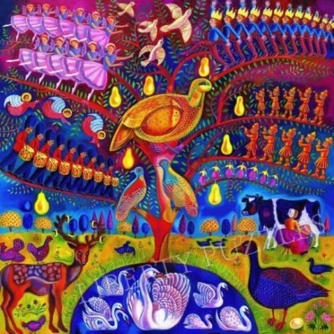 The Birth of Venus does have some pretty toys in it. This has Art Nouveau edges and a swarm of bicycles. I love the ripples and reflections in this Monet waterlilies, though Impressionism isn't my thing. Love the centaur, nymph, and faun in this crepuscular Maxfield Parrish. This has Dr. Seuss unicorns. This calligraphic carpet page is amazingly difficult, but it's too yellow for my blueness. Stunning ocean life, but I've just done a sea-themed puzzle. I like that ox-cart! I adore these swans, but the puzzle is tiny. And this picture is silly, but just look at those monster! And that labyrinth sun!