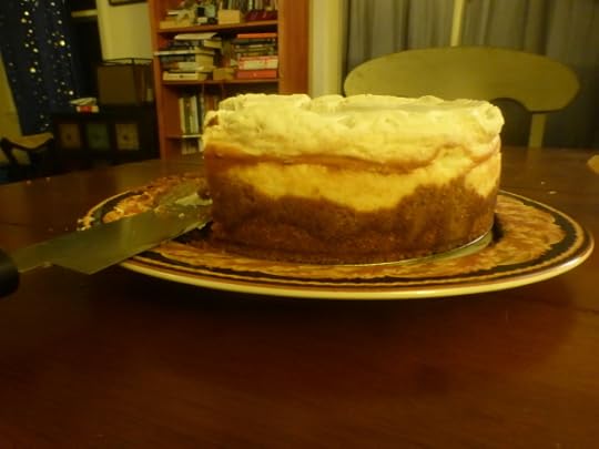 It's a baked cheesecake in two layers, a Romanesque cream cheese fortress topped with a Gothic sour cream clerestory. Can you say butterfat? I think the recipe was a wedding present in 1948.