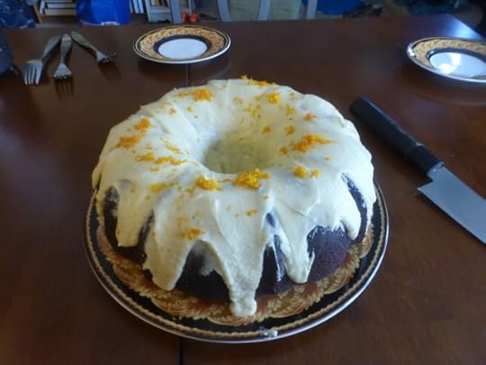 Yesterday's cake (waning fast): a dark chocolate bundt with an orange buttercream icing. Fox zested and squoze.