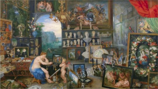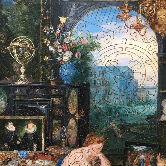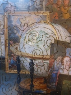 I celebrated high summer by puzzling The Allegory of Sight. Working on it was like being let to play with a mage's babyhouse. Of all the fabulous riches in that princely room, I would ask only for this cabinet, with the armillary sphere and the blue-and-white jar on it. And permission to walk in this idyllic garden.