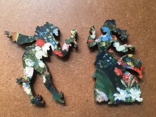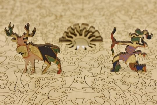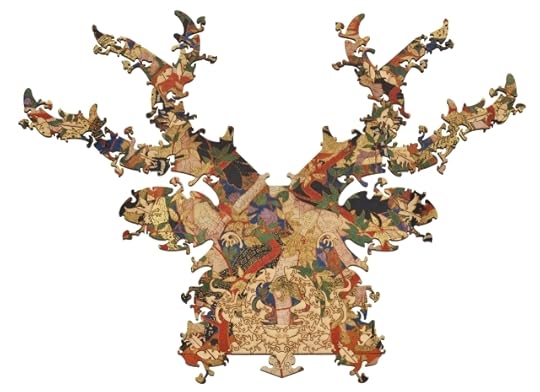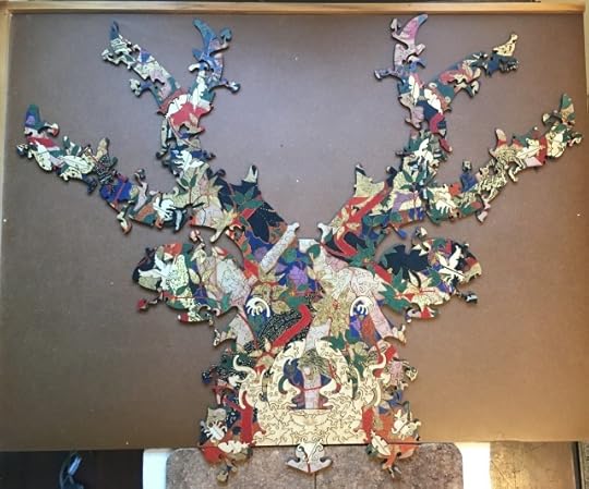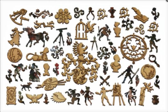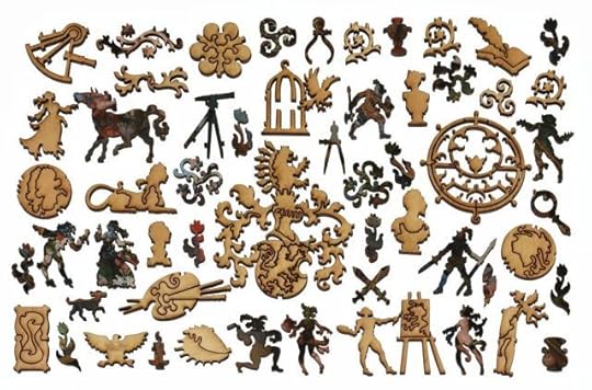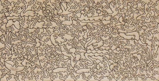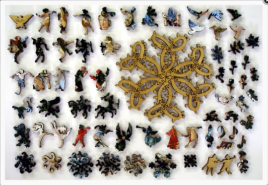 In a lower drawer, they found plain cardboard boxes, spilling wooden jigsaw puzzles. "Woodspells," said Craobh. Spells? Ariane remembered scenes of woolly innocence: the tabbied sleep of cottages amid their gardens; children bringing May; huntsmen on horses brown as gingernuts; sheepfolds and hayfields, with lads and lasses in their garlands of straw.Yet within the painted images were hidden shapes of wood, much loved: trees, stars, and crescent moons; a pair of spectacles amid the thatch; a teapot daubed with cloud; a child in the standing grass; a scythe; a ship caught in flowering thorn; a goose of reynard-colored sky; a cup in a hazel-copse; a sprawling hare, haunched with nightfall; a swan tumbled in a countrywoman's apron; a hunchback with a bundle of wood, whose nose Thos had broken. He'd filched other pieces for his games. Ariane remembered the oilcloth, owl-shaped scar among the sheep. When the puzzles were done, they were tenacious, hooked and barbed and burred, as delicately intricate as thistleseed: you could pick them up and shake them before they tumbled into atomies. Craobh turned these over and over, as if they were a text in some archaic tongue, the linear A of woods: not for their babbling prose, but analytically, for their grammar. Unravelled, it might weave for her.And now I own wooden jigsaw puzzles—sound English Wentworths and two dazzling Libertys—but until now I’ve lacked time and tables. Well, I do have tables at home, but they’re all groaning under a burden of unsorted books and papers. When I started sheltering here,