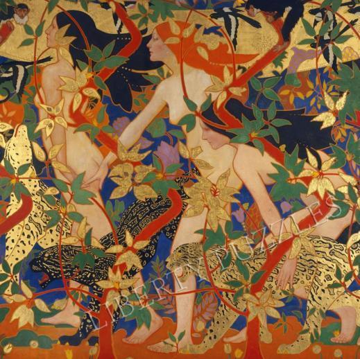 And for challenge, this astonishing Hunt (Diana and Her Nymphs), which is two puzzles in one. The original is by Robert Burns (no, not that one: Scottish Art Nouveau), from a mural painted for Crawford’s tearoom in Edinburgh, c. 1926. It puts me in mind of Hippolyta.